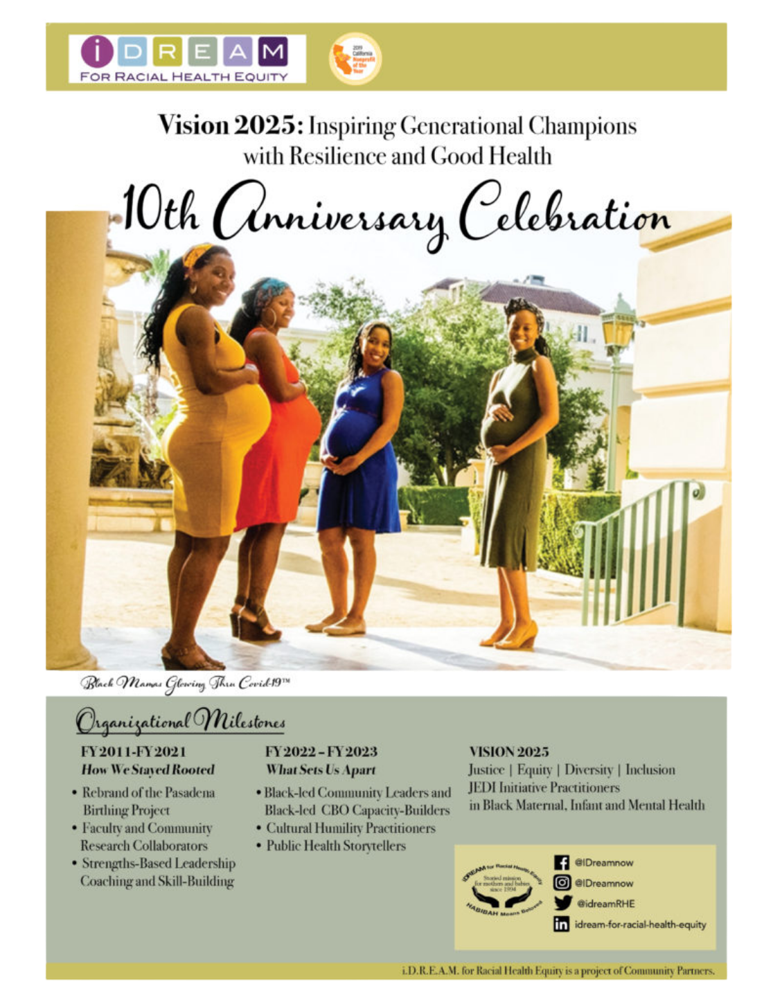 The former State Senator Holly J. Mitchell recognized i.D.R.E.A.M. as the 2019 Nonprofit of the Year in the 30th Senatorial District. Vision 2025 focuses on the urgent call for inter-generational leadership, training, advocacy and community service on behalf of Black birthing families. Recognized as a Black-led community-based organization rooted with a 27-year storied mission, we received multi-year funding (FY22 and FY23) for capacity building and sustaining our legacy during our 10th anniversary.